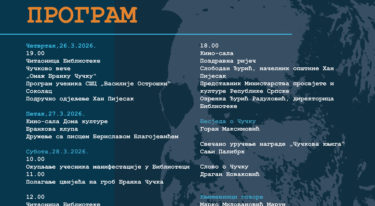 ЧЕТВРТАК, 26. 3. 2026. 19.00 Читаоница Библиотеке Чучково вече „Омаж Бранку Чучку“ Програм ученика СШЦ „Василије Острошки“ Соколац Подручно одјељење